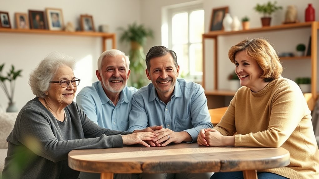Building emotional and social connections through support groups can considerably strengthen your resilience as a caregiver. Joining a group gives you a safe space to share feelings, frustrations, and successes with others who understand your experience. These connections reduce feelings of isolation and validate your emotions, making caregiving feel less overwhelming. Support groups also offer encouragement and practical advice, helping you develop coping strategies and maintain your mental health. Participating regularly helps you build a network of trusted individuals who can offer comfort and reassurance during difficult times. By connecting emotionally with others facing similar challenges, you’ll find a sense of belonging and understanding that bolsters your ability to provide care with strength and compassion. Incorporating holistic approach such as mindfulness and stress management techniques into your routine can further enhance your emotional well-being and resilience as a caregiver. Engaging in peer support networks can also provide additional layers of understanding and shared wisdom, strengthening your emotional foundation. Recognizing the importance of emotional and social connections can lead to more meaningful and sustainable support systems that benefit both you and those in your care.