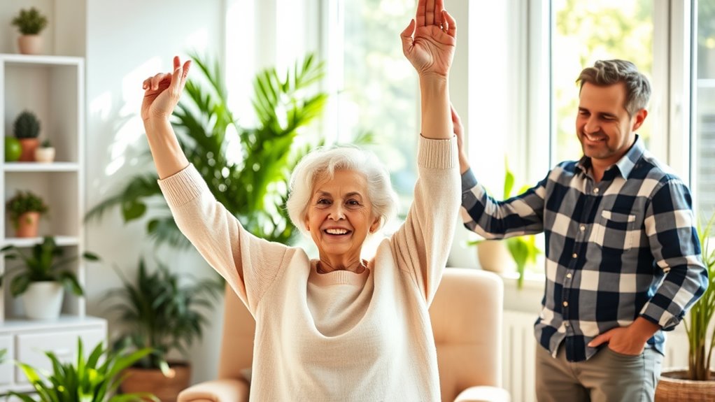 Integrating these gentle exercises into your parent’s daily routine can make consistency easier and more natural. Start by setting specific times, like morning or evening, to encourage regular practice. Incorporate exercises into everyday activities—doing wall snow angels while watching TV or hand stretches during a break. Use reminders or a simple calendar to track progress and keep motivation high. Keep sessions short—about 10 minutes—so they’re manageable and don’t feel overwhelming. Make it a family activity, encouraging your parent and involving others in the household. Consistency is key, so gradually increase repetitions or duration as strength improves. By embedding these exercises into daily habits, you help your parent build strength, flexibility, and confidence seamlessly.