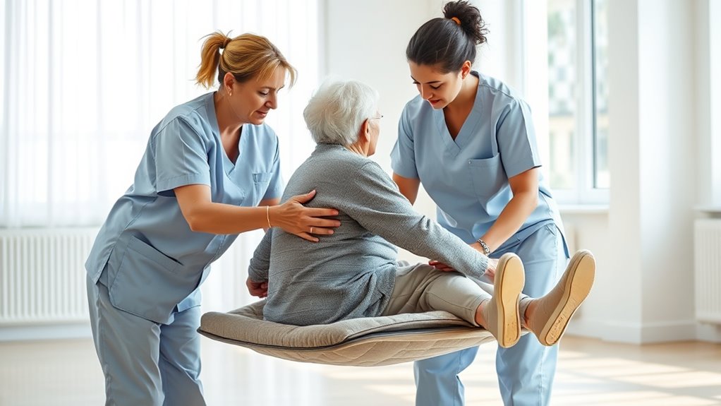 To move a larger senior safely, always plan the transfer first and clear the area of obstacles. Use assistive devices like slide sheets, transfer belts, or lifts to reduce your effort and prevent injury. Maintain proper body mechanics—bend your knees, keep your back straight, and engage your core. Communicate clearly with the senior and don’t attempt to lift alone if it feels unsafe. Explore more tips to master safe and effective transfers.