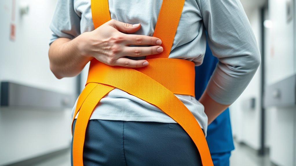 Using a transfer belt properly helps prevent falls and protects your back during patient assistance. Wrap it securely around the patient’s waist, avoiding the abdomen or chest, and make certain it’s snug but comfortable. Communicate clearly to ease anxiety and maintain control during transfers or ambulation. Good technique supports safety, reduces caregiver strain, and promotes independence. Keep in mind proper placement and secure fastening—continue exploring how to maximize safety and comfort with gait belts to become a confident caregiver.