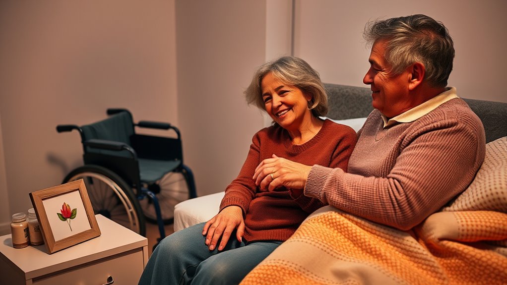 Balancing love and duty as a spouse and caregiver can be one of the most challenging roles you’ll ever face. Juggling these responsibilities requires emotional resilience—your ability to stay strong amid stress, uncertainty, and exhaustion. When you’re consistently giving your energy to caring for your loved one, it’s easy to forget about your own needs, which can lead to burnout. Building emotional resilience isn’t just about toughening up; it’s about recognizing your limits, seeking support when needed, and maintaining a sense of hope. Developing this resilience helps you stay emotionally available and present, which is essential for keeping your relationship alive and intimate. emotional resilience also involves cultivating self-compassion and acknowledging your own feelings, which can strengthen your capacity to cope with caregiving challenges. Effective communication strategies play an important role in managing this delicate balance. Open, honest conversations create understanding and prevent misunderstandings that can strain your relationship. When you share your feelings—whether they’re of frustration, sadness, or hope—you foster a safe space that encourages your partner to do the same. This mutual openness strengthens your emotional connection, making it easier to navigate caregiving challenges without losing intimacy. It’s important to listen actively, showing genuine concern and empathy, even when your mind is overwhelmed. Small gestures of reassurance, like a touch or a kind word, can convey support and love amid the chaos.