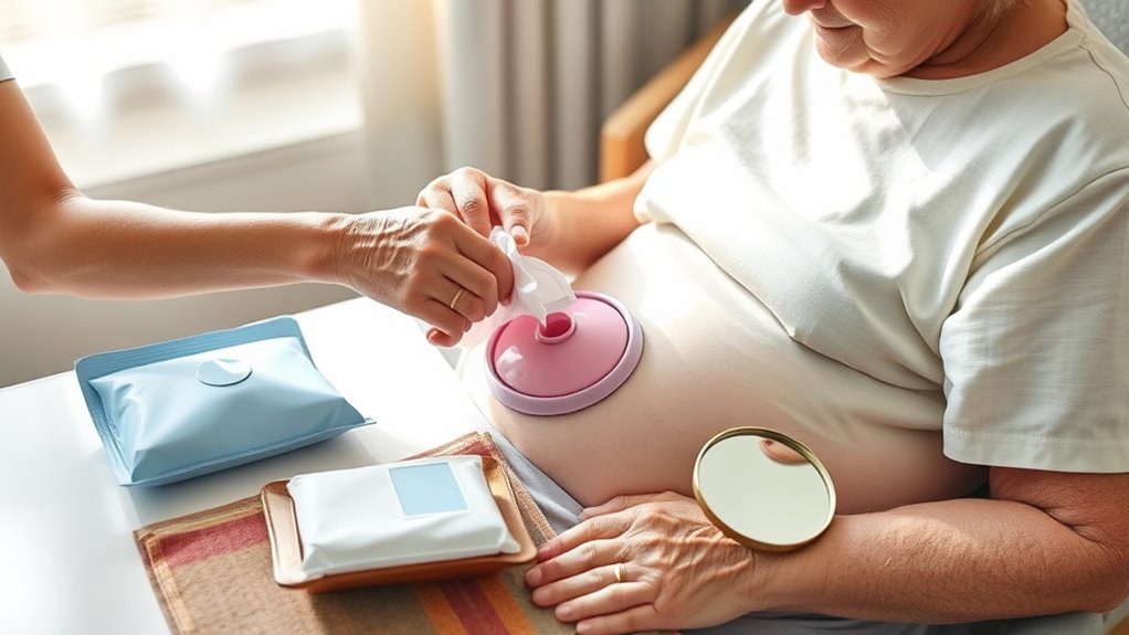 During routine care, watch for signs of skin irritation such as redness, soreness, or skin breakdown. If you notice persistent irritation or infection symptoms like swelling, pus, or a foul smell, consult a healthcare provider immediately. Proper stoma management also involves educating yourself about different adhesive types and techniques, so you can adapt to changes in your loved one’s skin or stoma size. Remember, patience and careful attention to detail are key. Consistent, gentle skin care and a well-fitting pouch will help your loved one stay comfortable and confident. By staying proactive and informed, you can profoundly improve their quality of life and minimize common issues like skin irritation or leaks.