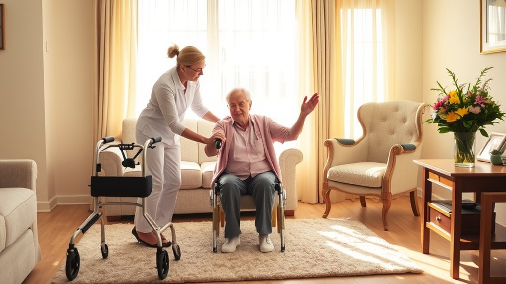 These adjustments promote confidence and safety, helping your loved one navigate their environment more securely. Regularly reassess the space as recovery progresses, making modifications as needed to support ongoing mobility and safety.