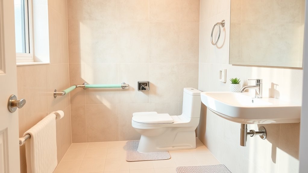 To prevent slips and falls in your bathroom, start by ensuring bathtub safety with grab bars and installing non-slip mats inside and outside the tub. Always dry the floor after use and encourage the use of footwear with good grip. Keep the area clutter-free, and consider adding a shower chair for added stability. These simple measures drastically reduce fall risks and create a safer bathroom environment.