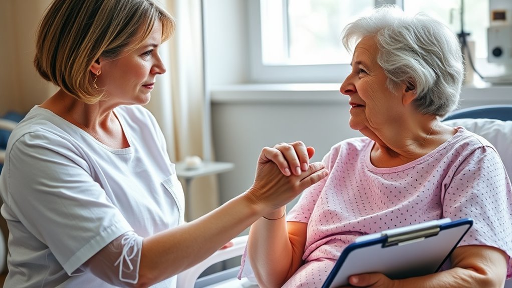 Effective communication with healthcare providers is crucial to guarantee your parent receives the best possible care during their hospital stay. Clear, direct conversations help ensure everyone is on the same page about your parent’s needs and preferences. Be specific about your parent’s medical history, current symptoms, and concerns. Prepare questions beforehand and ask for clarification if anything is unclear. Keep detailed notes of all discussions and instructions. Understanding medical terminology can help you better interpret information and advocate effectively. Use plain language to avoid misunderstandings. Summarize key points to confirm understanding. Encourage healthcare providers to explain diagnoses and treatments thoroughly. Advocate for your parent by voicing concerns calmly and confidently. Recognizing the importance of patient-centered communication in fostering trust and ensuring comprehensive care is essential. Effective communication fosters trust, reduces errors, and ensures your parent’s needs are prioritized. Developing active listening skills can further improve your interactions with medical staff. Engaging in effective communication techniques can help you convey your parent’s needs more clearly and confidently. Additionally, being aware of regulatory requirements can help ensure your parent’s rights are protected throughout their hospital stay. Your active involvement makes a significant difference in their care experience.
