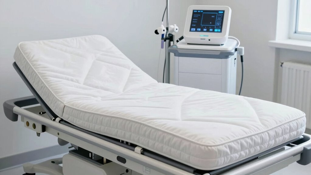 Safety and alarm features are crucial when choosing an alternating pressure mattress system because they provide essential protection for patients and peace of mind for caregivers. These features include low-pressure alarms and visual alerts that notify us of system malfunctions or inadequate pressure, preventing skin breakdown. Alarm systems should activate automatically during power outages or system failures, ensuring continuous pressure support. Whisper-quiet alarms operating below 40 dB let patients rest undisturbed while alerting staff promptly. Some systems even include emergency deflation or CPR functions, allowing quick pressure release for immediate access. Reliable alarm features are indispensable in long-term care settings to prevent pressure ulcers and ensure patient safety. Overall, robust safety and alarm mechanisms are indispensable when selecting the right pressure mattress system.