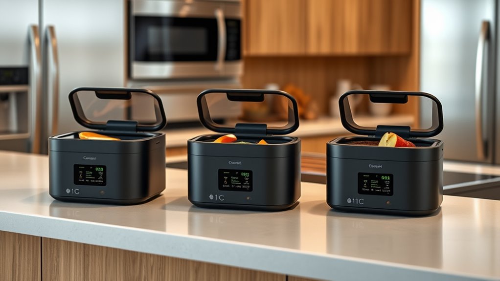 If you’re looking for the best electric compost bins for your kitchen, I recommend models like the Vitamix FC-50 Food Processor and Recycler, a compact 3L indoor recycler, and a sleek 3L electric composter designed for small spaces. These devices turn food waste into nutrient-rich soil quickly, while controlling odors and noise. They’re user-friendly, eco-friendly, and ideal for sustainable living. Keep exploring to discover which one fits your needs perfectly.