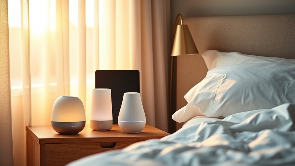 Choosing the right sound and light options is vital to creating a relaxing sleep environment with a Hatch Restore 2 alternative. I look for devices that offer a variety of sounds like white noise, nature sounds, or meditative audio to match my preferences. Adjustable brightness levels and color settings are essential for customizing the lighting to promote relaxation and comfort. A wake-up light feature, such as sunrise simulation, helps me wake up gently instead of abruptly. I also check if the device has timers or schedules, so I can automate sound and light routines throughout the night for consistent sleep patterns. Finally, supporting multiple sound and light profiles allows me and my family to personalize our sleep environments, ensuring everyone gets a restful night.