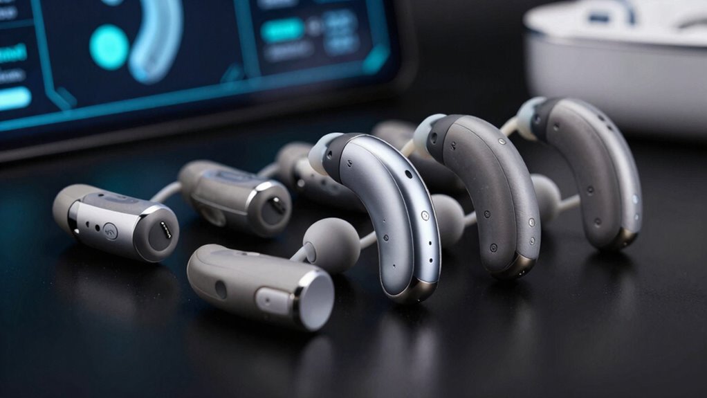 When choosing hearing aids for tinnitus relief, I consider factors like sound customization options and noise cancellation to guarantee I get the right balance of comfort and effectiveness. Compatibility with tinnitus masking features and battery life are also vital, so I don’t have to worry about frequent recharging or replacement. Finally, I look for a discreet, comfortable fit that I can wear all day without discomfort.
