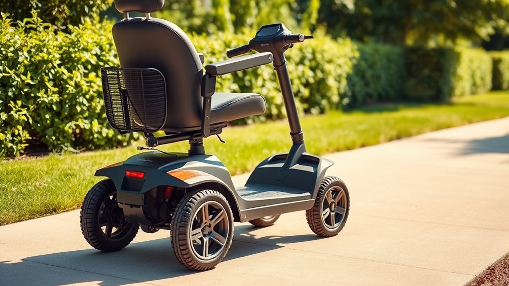 I’ve learned that regular maintenance is key for heavy-duty mobility scooters, much like tuning a high-performance engine. I check the tires monthly for wear, keep the batteries charged and clean, and lubricate moving parts every few months. Just like a car, neglecting these routines can lead to breakdowns or safety issues. Staying proactive with maintenance guarantees my scooter runs smoothly and safely, giving me peace of mind every day.