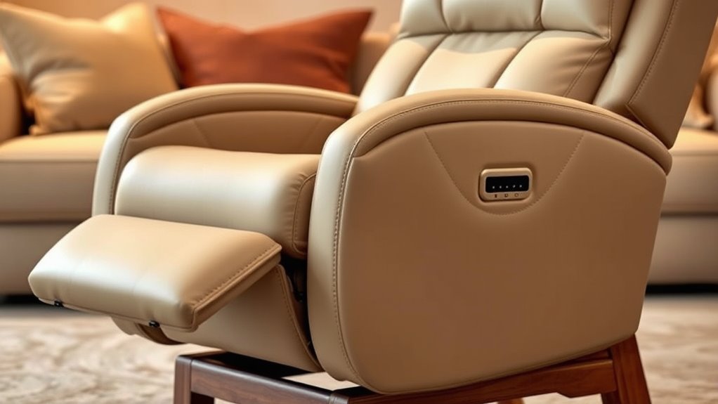 Adding extra features to a lift recliner with heat and massage can considerably boost its convenience and comfort. I look for practical additions like USB charging ports, cup holders, and side pockets, which keep essentials handy during relaxation. Remote controls are a must—they make adjusting massage modes, heat levels, and recline positions effortless. Some models offer customizable massage options, allowing me to select different modes, intensities, and timers for a personalized experience. Safety features such as anti-tipping designs and built-in mechanisms give me peace of mind during use. Extras like zero gravity positions, heated lumbar zones, and full-body support can enhance comfort and therapeutic benefits. These features turn a basic recliner into a truly tailored and relaxing experience.