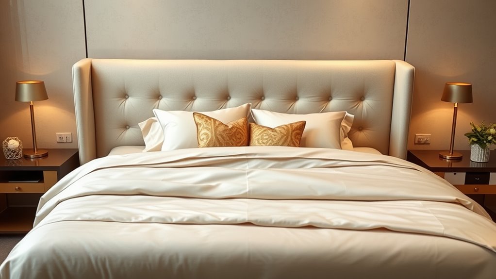 High-end adjustable beds require minimal maintenance, but I recommend regular cleaning with a soft, damp cloth to keep the surfaces looking new. Check the mechanical parts and remote controls periodically to guarantee smooth operation. Keep the motor vents clear of dust and debris to prevent overheating. Also, follow the manufacturer’s instructions for any specific care tips. Doing these simple steps helps your bed stay comfortable and functional for years to come.