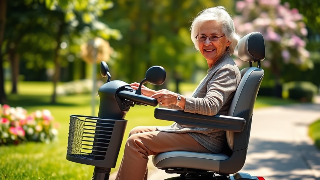 Did you know that choosing a scooter with the right size and weight capacity can prevent accidents and extend its lifespan? I recommend measuring your height and width, then selecting a model that comfortably fits your frame. Also, check the weight capacity—most seniors need at least 250 pounds, but if you carry extra items or have a larger build, opt for a higher limit. Safety and comfort go hand in hand.