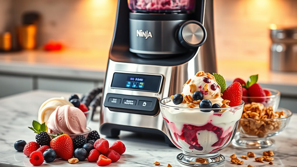 Have you ever considered how the variety of recipes can elevate your experience with the Ninja Creami Deluxe? A wide range of recipes lets me explore different frozen treats like ice cream, sorbet, gelato, milkshakes, and Italian ice, making dessert time exciting. Recipes with mix-ins such as candies, nuts, fruits, and chocolates let me personalize flavors and get creative. I also appreciate options tailored for dietary needs—dairy-free, vegan, low-carb, or high-protein—so everyone’s preferences are covered. Having diverse recipes encourages me to develop new skills, experiment with textures, and enhance my culinary confidence. Plus, a broad selection ensures I can enjoy different frozen desserts for any occasion or season, keeping my dessert game fresh and versatile.
