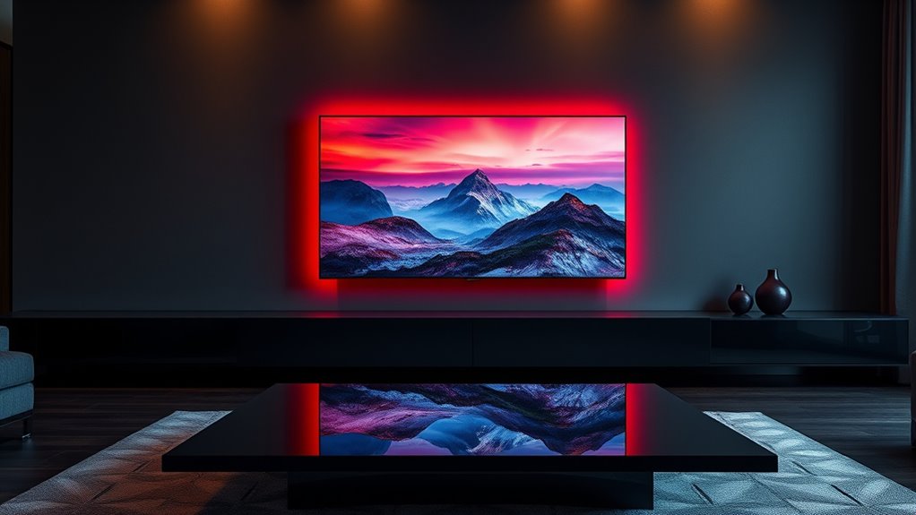 Focusing on picture quality features can markedly enhance your viewing experience, especially during Cyber Monday deals where premium models are often discounted. I recommend looking for OLED TVs that support advanced HDR formats like Dolby Vision, HDR10+, and HLG, which deliver vibrant, detailed images. AI-powered upscaling technology is also a game-changer; it can improve lower-resolution content to near-4K clarity. Prioritize models with self-lit OLED pixels, offering perfect black levels and high contrast for cinematic visuals. High peak brightness and a wide color gamut ensure vivid, accurate colors across scenes. Features such as Filmmaker Mode and real-time scene analysis help preserve the director’s original vision, adding realism and depth to your viewing. These picture quality features are essential for an immersive experience.