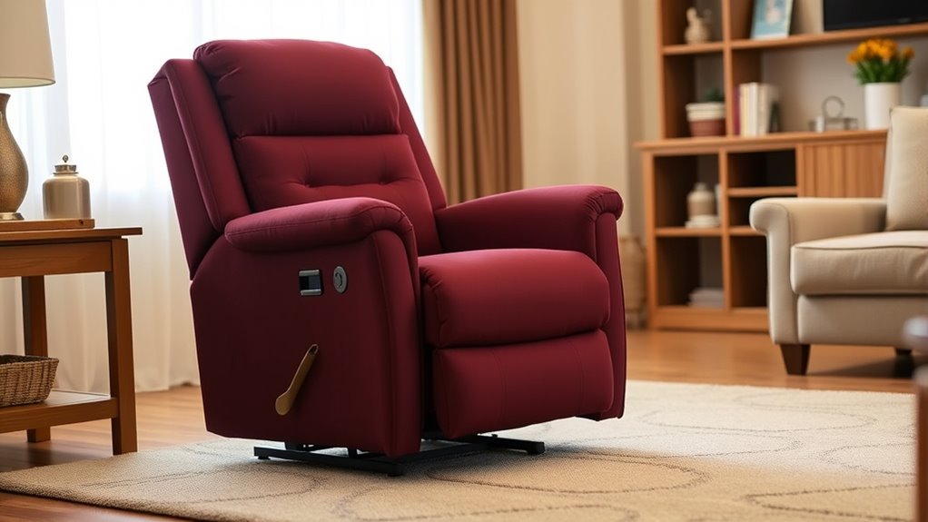 Choosing the right power source for a lift chair is essential because it directly affects how reliably and safely the chair operates. Most lift chairs need an external AC outlet to power their motors and electronics. While some models include battery backup systems, these require regular charging or replacement to guarantee functionality during power outages. The standard voltage for most chairs in North America is 110V or 120V, matching household current. Placement near a power source is critical to avoid extension cords, which can be be safety hazards or impair performance. Additionally, the power cord length varies, typically between 6 and 9 feet, so consider your room layout to make sure the chair can be positioned comfortably without stretching or unsafe cord placement.