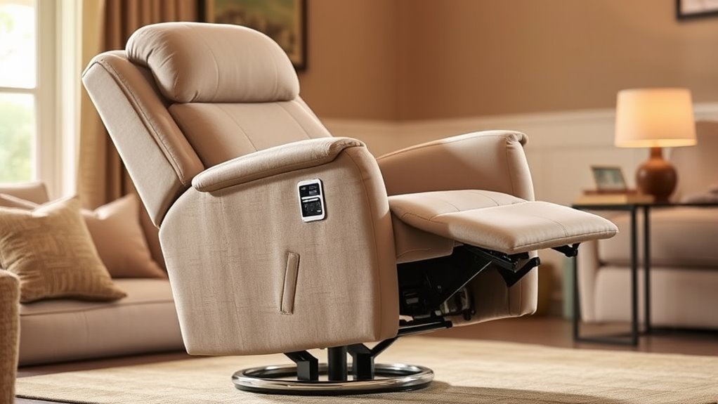 These recliners come with safety features like sturdy, anti-slip bases to prevent tipping, and built-in safety locks to avoid accidental recline or lift. I also appreciate the remote controls with easy-to-use buttons that have safety locks, preventing unintended adjustments. Many models include battery backup systems, ensuring safe operation during power outages. Overall, these features give me peace of mind knowing that I’m safe while enjoying comfort and independence.