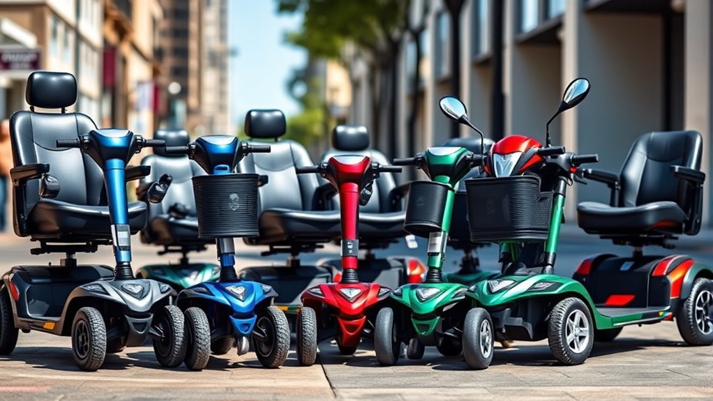 When selecting a mobility scooter, safety features play a vital role in guaranteeing confidence and peace of mind during every ride. Electromagnetic brakes provide immediate stopping power when I release the joystick, preventing accidents. Anti-tip-over devices and stabilizers are essential for preventing rollover on uneven surfaces or during sharp turns, boosting stability. Proper lighting, including headlights and taillights, improves visibility during night rides or in low-light conditions. Safety certifications like UL 2272 ensure the scooter meets strict electrical and fire safety standards, giving me confidence in its reliability. Additional safety components, such as rearview mirrors and warning alarms, help me stay aware of my surroundings and avoid potential hazards. These features collectively make my rides safer and more secure.