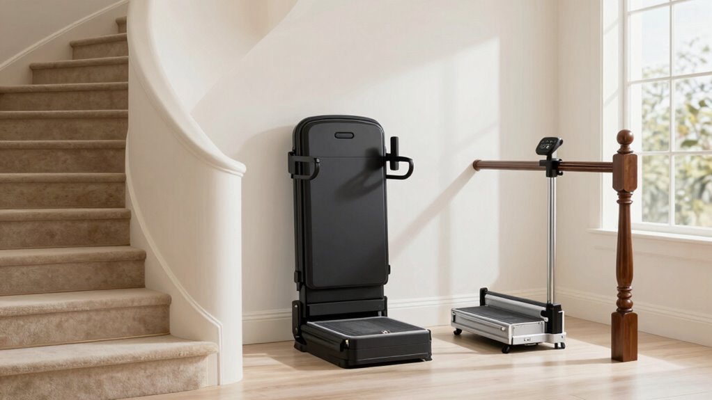 Selecting a stair lift that fits your home requires careful measurement of your staircase and surrounding space. I recommend measuring both the width and length of your staircase to ensure the lift fits comfortably without blocking doorways or furniture. Pay attention to the top and bottom landings, making sure there’s enough space for the lift’s clearance and safe operation. Check the maximum seat width and track length specifications to match your staircase dimensions and user comfort. Also, consider overhead clearance—your lift needs enough height to operate smoothly without hitting ceilings or light fixtures. Finally, evaluate the lift’s folded profile to confirm it’s compact enough to avoid blocking pathways or creating hazards when not in use. Proper space planning ensures a seamless fit and safe use.