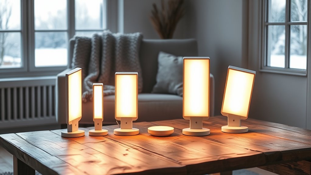 Choosing a SAD lamp that’s portable and appropriately sized can make a big difference in maintaining consistent light therapy during winter. Lightweight models, weighing between 1 to 3 pounds, are easy to carry around and move between rooms or locations. Compact designs, around 6 to 8 inches in diameter, fit comfortably on desks, nightstands, or travel bags. Battery-operated or USB-powered lamps are especially convenient, removing the need for constant outlet access while on the go. Foldable or collapsible models are designed for travel, making packing simple. When selecting a size, aim for a balance: the lamp should be large enough to provide effective coverage but small enough to remain portable. This guarantees you get the therapy benefits without sacrificing convenience.
