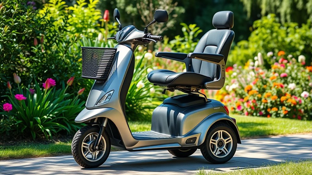 When selecting a senior mobility scooter, prioritizing user comfort is essential for ensuring enjoyable and stress-free rides. Adjustable seats with ergonomic padding and height options make long rides more comfortable, reducing fatigue. Wide, cushioned seating with support features helps alleviate pressure points, keeping you comfortable even during extended use. Shock absorption systems and all-terrain tires improve ride smoothness on uneven surfaces, minimizing jolts and vibrations. Armrest and handlebar adjustability allow for personalized positioning, enhancing control and reducing strain. Proper weight distribution and stability features prevent wobbling, boosting confidence and safety. By considering these comfort factors, you’ll find a scooter that feels natural to ride, supports your body, and makes every trip more pleasant.