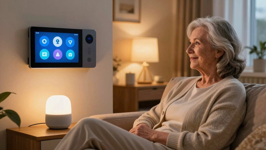 Choosing smart home devices that are easy for seniors to use is essential for ensuring their safety and independence. Devices with large, clearly labeled buttons and simple interfaces make operation straightforward, reducing frustration. Voice-activated features are especially helpful, allowing seniors to control devices without fiddling with small controls. Wireless systems that require minimal setup and little configuration also lower technical barriers, making adoption easier. Visual indicators like flashing lights or digital displays help those with hearing or vision impairments understand alerts quickly. Additionally, devices with one-touch activation, such as emergency buttons, improve responsiveness and safety. Prioritizing ease of use guarantees seniors can confidently operate their smart home systems, enhancing both their security and peace of mind.