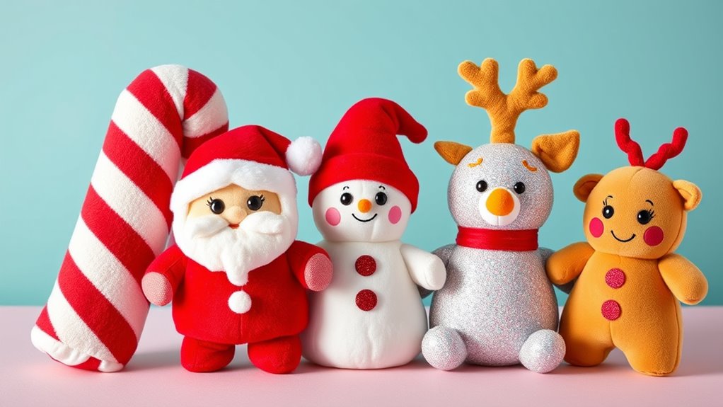 If you’re looking for the best Squishmallows holiday collectibles for 2025, I’ve got you covered. I recommend the adorable 8-inch Rudolph, Emmy the Elf, the 12-inch Tolef Cookie Bear, along with the 10-inch Brooke the Polar Bear and Ernesto with a peppermint latte theme. These plushes are super soft, festive, and perfect for cuddling or collecting. Keep exploring to find out more about these limited-edition treasures!