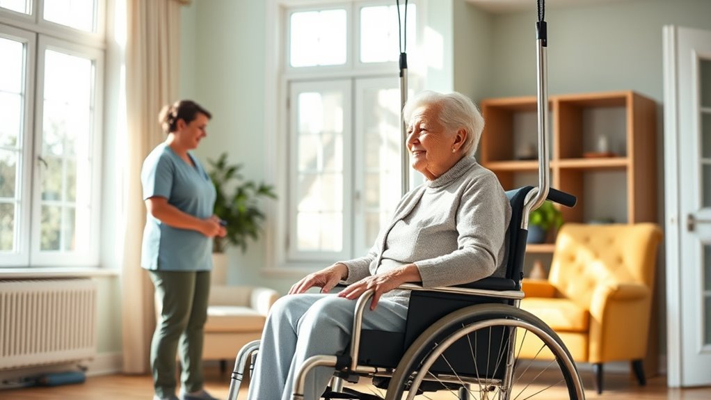Ever wondered how easy it really is to operate a transfer lift? The key lies in intuitive controls like simple buttons or levers that reduce caregiver effort. Clear instructions and straightforward assembly make setup quick and safe, so you won’t struggle with complicated procedures. A lightweight design with ergonomic handles helps maneuver and position the lift with minimal effort, reducing fatigue. Features like quick-release mechanisms and minimal adjustments streamline transfers, making the entire process smoother. Visual indicators, such as color-coded parts or safety labels, enhance usability, especially for caregivers with limited training. When choosing a lift, prioritize these user-friendly features to ensure safe, efficient, and comfortable transfers for your loved ones—simplicity makes all the difference.